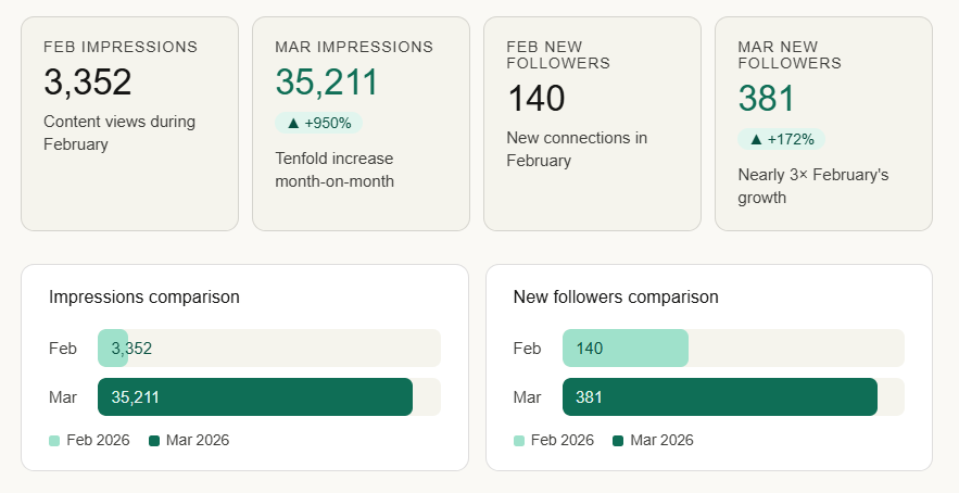 I manage LinkedIn for Being Real, a workplace mental health consultancy doing genuinely important work. Social media is just one small part of what I do — but the numbers from last month tell a story worth sharing.